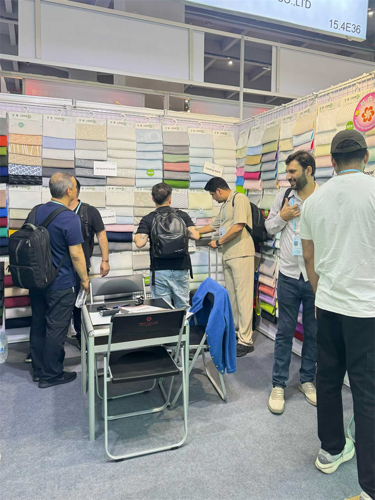本届广交会规模空前,汇聚了超过3.2万家企业,吸引了来自全球217个出口市场的超20万客商奔赴盛会。现场人气火爆,商机涌动。大发经编的展位前咨询洽谈的客商络绎不绝,我们主打的三明治网布以其透气、支撑性佳、品类丰富等特性备受关注,而采用先进3D软体材料制成的家纺产品,则凭借其独特的舒适体验和科技感,成为吸引新老客户驻足洽谈的亮点。